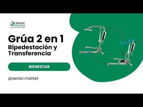 La Grúa 2 en 1 Ref 1401.1010 es un dispositivo de elevación versátil y robusto, diseñado para adaptarse fácilmente a las necesidades de traslado y bipedestación del usuario. Su principal característica es la capacidad de transformarse de grúa de elevación a bipedestación con un sencillo cambio de brazo, gracias al uso de palometas que aprovechan la misma estructura para ambos modos. Esto facilita el manejo y reduce la necesidad de disponer de dos equipos distintos.