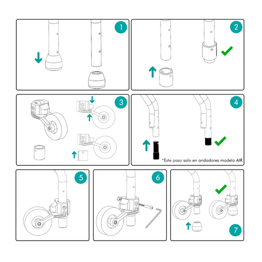Kit de ruedas basculantes para patas traseras de andador de 22, 25 y 30mm de diámetro